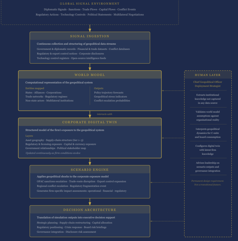 A system that allows the two models to interact, so geopolitical developments can be tested against the firm’s operating architecture.